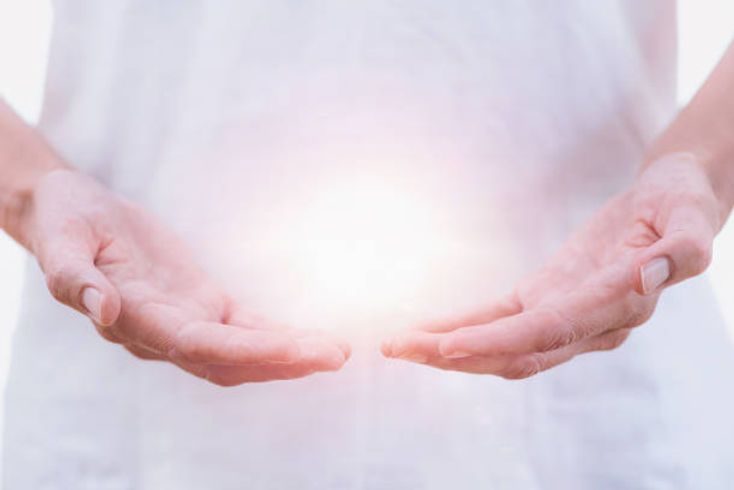 L' Imposition des mains : J'utilise mes mains pour travailler directement sur le corps physique et sur l'aura. Ce procédé permet de décharger les énergies usées, d'apaiser les zones douloureuses et de transmettre une énergie de régénération ciblée.